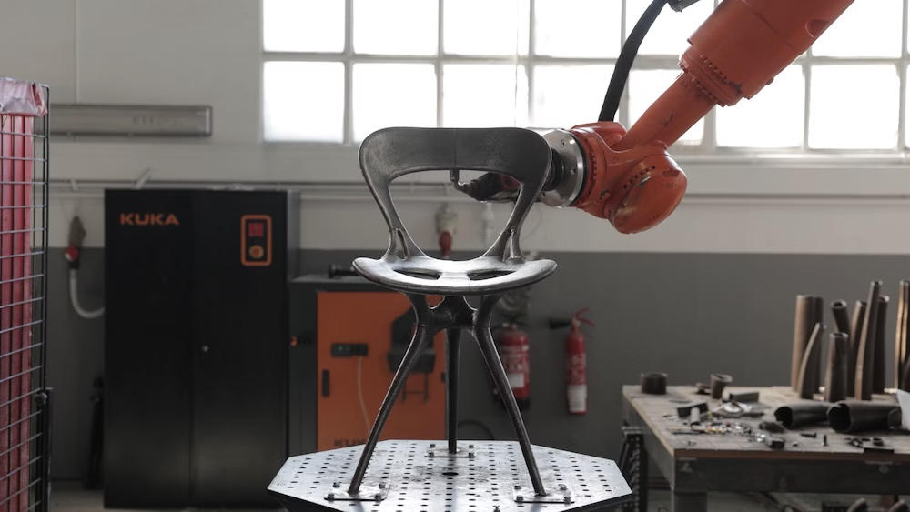 在设计定稿后,团队采用机器人3D打印技术将数字模型转化为实体椅子。成品以金属材料制成,表面保留了3D打印的层次纹理,呈现出未来主义美学与工艺痕迹的完美融合。Lovegrove表示:“它非常美丽,就像树上的年轮,记录着它如何开始,如何结束。”