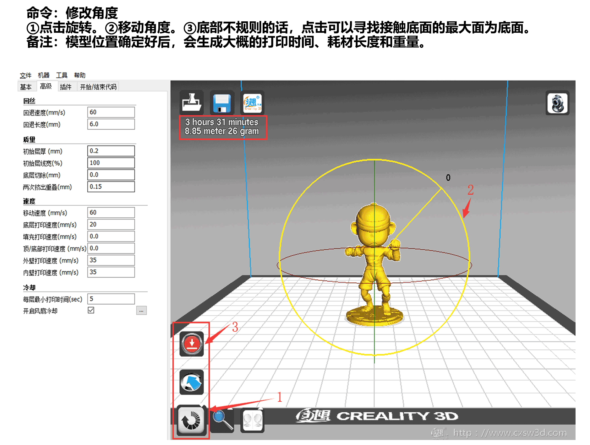 备注:模型位置确定好后,会生成大概的打印时间、耗材长度和重量。