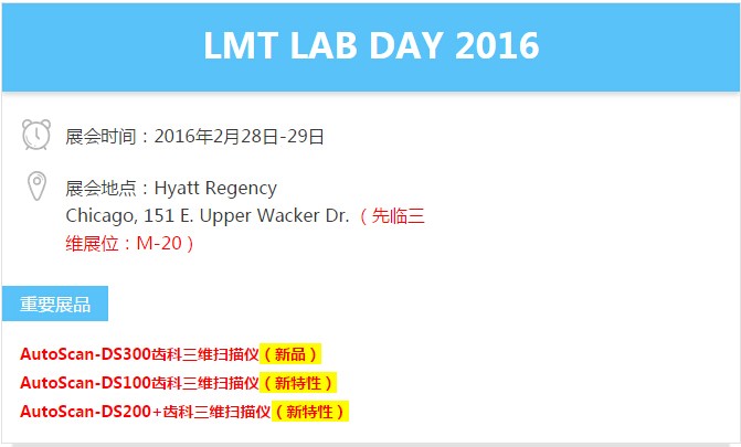 2016年2月28日-29日,先临三维将赴美国芝加哥参加国际齿科界一年一度的盛大展会LMT LAB DAY 2016,并于本次展会上发布三款齿科三维扫描仪。随着中国社会老龄化的发展及人们生活水平的提高,牙齿修复、烤瓷牙、种植牙等变得越来越流行。而在牙科医疗中,齿科三维扫描仪正在发挥着越来越重要的作用。