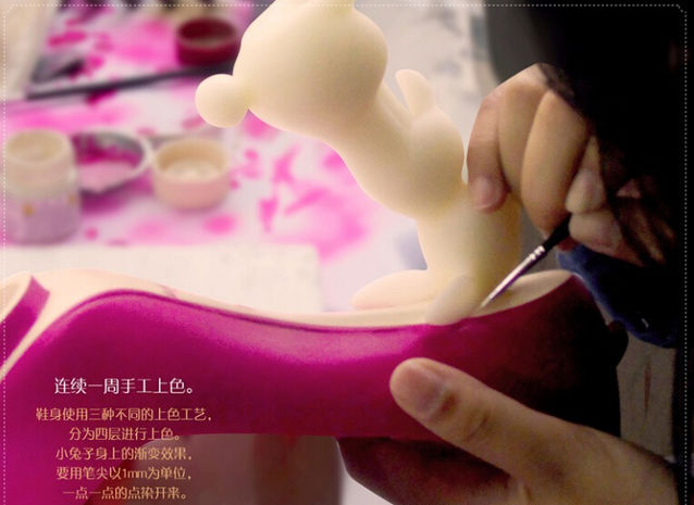 婚礼现场的胸针与婚鞋由北京魔猴网进行设计与制作。婚鞋底部打印者夫妻二人的心形指纹,寓意永结同心。鞋跟上的两只可爱的小兔子,为包贝尔特意为妻子挑选的生肖兔。整个婚鞋制作耗时216个小时,后期打磨与上色均由十年以上经验的手工匠人进行,鞋子表面光滑如镜,鞋身和鞋跟颜色饱满、生动。婚鞋一改以往的3D打印服务基础、粗糙的模型形象,令整个3D打印行业以及社会大众耳目一新。