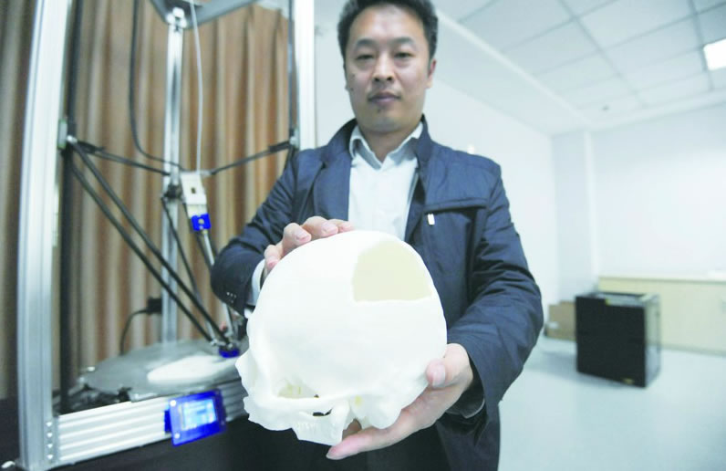 记者了解到,5月12日,在3D打印技术的支持下,城阳人民医院神经外科成功为一名患者进行了颅骨修复手术。城阳人民医院医学3D打印中心主任蓝孝全告诉记者,该患者左侧颅骨有大面积的不规则破损,需要植入钛合金网修复,传统的手术需要打开患者伤口,根据伤口形状来制作钛合金网,匹配制作过程中患者的伤口将处于敞开状态,容易感染,患者也较为痛苦。而用上3D打印技术后,手术前,医护人员对患者进行头部CT扫描,将数据导入建模软件进行3D建模,然后按照1:1比例进行打印,打印好的受损颅骨模型与实际人脑误差在0.1毫米之内,完全能达到手术需要。
