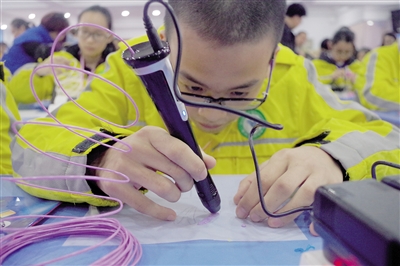 8日上午,在重庆市珊瑚中学第十六届教育教学开放周上,珊瑚中学八年级17班的同学们,用手中的3D打印笔上了一堂不一样的美术课。