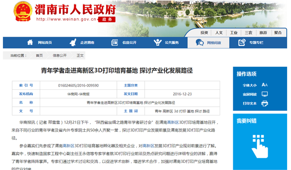 时间:2016-12-23 13:35 来源:渭南市人民政府 作者:中国3D打印网 阅读:次