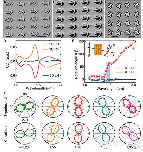 图4. 基于纳米剪纸三维风车型纳米结构阵列的超手征特性。(A)FIB加工的二维风车型结构及(B)纳米剪纸形成的三维风车型结构阵列。(C)左旋与右旋三维风车型结构顶视图。(D,E)二维和三维风车型结构阵列的圆二色谱和偏振旋转光谱(对应于圆双折射特性)对比图。显示出纳米剪纸导致结构光学特性发生的巨大变化。(F)对应于图(E)的各波长处偏振旋转的极坐标图。理论与实验十分吻合。Scale bars: 1 μm。