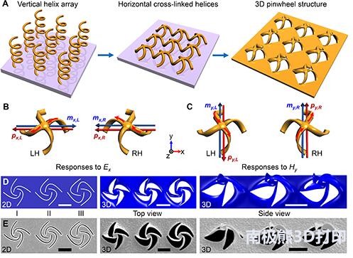 图3. 基于纳米剪纸技术的三维光学超手征体的构建。(A-C)结构设计思路。(D)理论设计的三种风车型纳米结构及(E)实验论证。Scale bars: 1 μm。