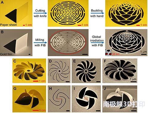 图1. 宏观剪纸与纳米剪纸。(A)宏观剪纸过程。(B)利用FIB刻蚀及全局帧扫描在80nm厚悬空金薄膜上进行的纳米剪纸过程。(C, G)宏观剪纸结构及其对应的(F,J)纳米剪纸三维立体结构扫描电镜图。(D,H)发生立体形变前的二维结构图案与(E,I)发生形变后的三维纳米结构图案顶视图。宏观与纳米结构的比例大小约为:10,000:1。Scale bars: 1 μm。