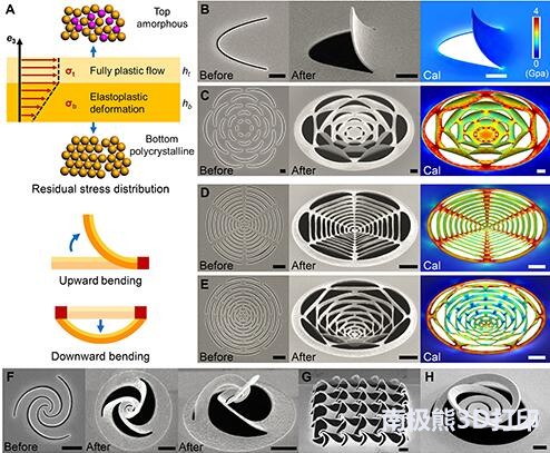 图2. 基于形貌诱导应力自平衡和闭环形变的纳米剪纸技术。(A)纳米剪纸过程中金纳米薄膜发生形变的物理机制。(B-E)二维结构图案、纳米剪纸形成的三维立体结构及其理论模拟结果。(F-H)纳米剪纸制备的形貌特异的三维纳米结构。Scale bars: 1 μm。
