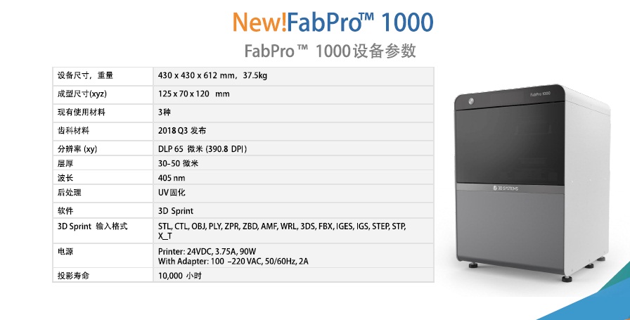 FabPro™ 1000作为3D Systems公司首款采用DLP技术的产品,集3D Systems公司多年来在小型3D打印机开发方面之大成,以工业级的精度、前所未有的打印速度、超凡的打印稳定性和相对低廉的价格为产品开发目标,2018年3月首次亮相上海TCT Asia即获得国内市场追捧,交口赞誉为性价比超高的入门级工业3D打印机。