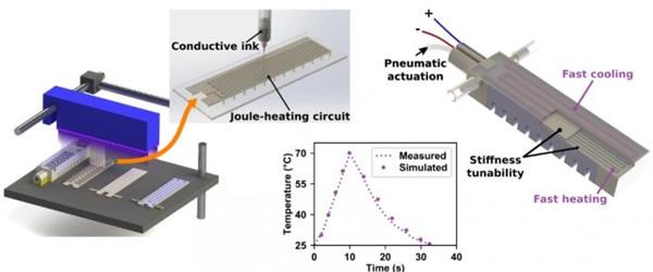 它们的执行器包括一层热活化形状记忆聚合物(SMP),其是根据其温度改变硬度的材料。先前使用SMP制造执行器的尝试导致响应缓慢且定义有限。但是,跨国研究团队使用直接墨水书写和多材料3D打印将加热和冷却元件嵌入到执行器中,创造了第一个快速响应,刚度可调(FRST)软驱动器。