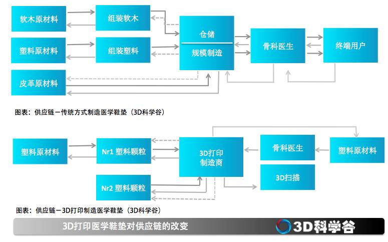 传统制造矫正鞋垫通常采用机械加工和手工相结合的方式。在制造过程中需要对软木、塑料、皮革等主要部件备有一定的库存量。在传统模式下,如果需要定制一副矫正鞋垫,用户需要和医生、制造商进行多次沟通。医生需要留下用户的脚部印模,然后将印模和设计数据提供给制造商。制造商收到这些资料之后,使用数控机床加工鞋垫。鞋垫制造出来以后,制造商将鞋垫交给医生安排用户进行试戴。往往大多数用户需要对鞋垫进行修改。在这种情况下,鞋垫将被返还给制造商进行优化。整个制造流程约花费4-6周。 3D科学谷认为,使用3D打印技术来定制鞋垫供应链将会被改变。 3D打印供应链 医生使用三维扫描获取用户脚部数据,然后将扫描数据提供给设计师。设计师根据扫描数据进行建模以及设计优化,让用户脚部数据与鞋垫足够拟合。设计数据提交给3D打印机将鞋垫打印出来。3D打印机的地点则非常灵活,既可以是制造商的3D打印机,也可以是医院的3D打印机,甚至可以是用户附近的3D打印机。