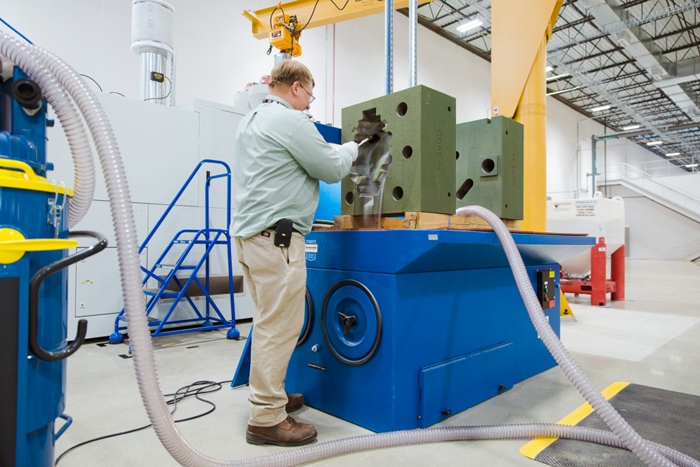 工程师正用一种放电设备将3D打印金属部件从基板上分离开