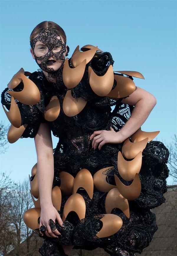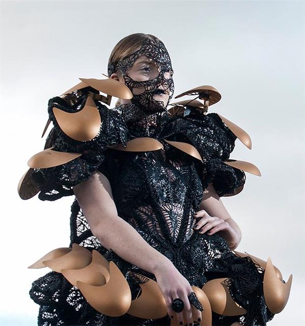 没有3D打印,这件衣服就没法完成。衣服本身由不同的两层组成。黑色部分全部用3Doodler笔手工3D打印,形成一个显然能让人联想起昆虫外骨骼的结构。这一过程的完成一定令人痛苦而缓慢。大量的小部件由黑色聚酯纤维和丝线连接在一起。
