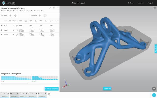 用户上传自己的STEP文件到Generate平台上后,他们可以同时运行多个模拟仿真过程。Generate公司认为在过去,一个设计师可能要等几个小时甚至是一夜的时间来获得一个优化的结果,然后再进行下一个优化过程,进入新的等待周期。Generate让设计者可以评估多达10个或者20个,甚至更多的优化过程,因为所有的处理发生在云中。这将设计周期从一个月缩短到几天或一个星期。