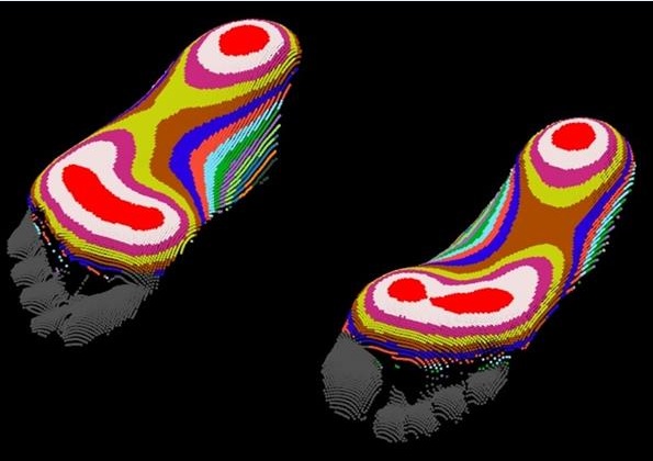 一旦捕获脚部的扫描信息,就会自动生成3D模型---客户的唯一模型,将用作设计定制全长中底的基础。众所周知,每个人的双脚尺寸不一致,因此OLT Footcare需要分别扫描两只脚,以便最大限度的让客户穿上舒适、合脚的鞋子。