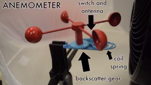 例如,他们制造了一个风速表(就是用来测量风速的东西),并将其固定在一个齿轮上。当齿轮旋转时,齿轮与嵌入物体的天线相连,然后天线就能反射周围的WiFi信号,而这个信号可以通过WiFi接收器解码。