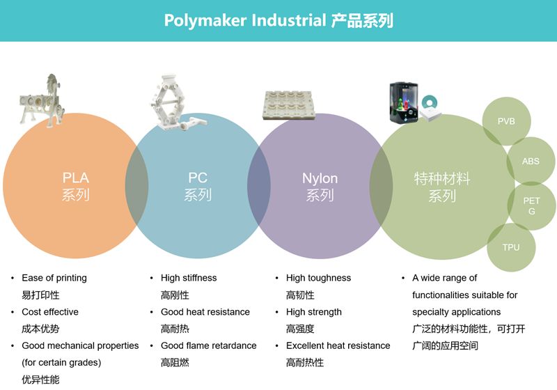 工业应用板块方面,Polymaker在2017年初推出了Polymaker Industrial的产品线,其以开发兼顾高性能与经济性的先进材料为目标,包含了超过4大产品体系和超过20种不同的3D打印工程塑料及应用解决方案。
