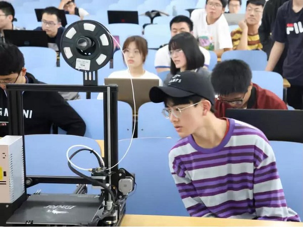 在培训现场,战队项目经理利用创想三维Ender-3S 3D打印机,给大家展示了3D打印的具体实现过程,包括换耗材、回原点、加热等。参会的同学们都兴致勃勃地聚在机器旁,观察这奇妙的3D打印技术。