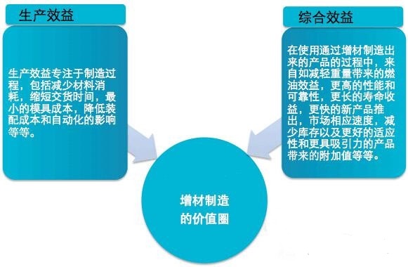 金属增材制造的好处可以从两个方向来理解-一个是生产效益,另一个是综合效益。生产效益专注于制造过程,包括减少材料消耗,缩短交货时间,最小的模具成本,降低装配成本和自动化的影响。而综合效益是指在使用通过增材制造出来的产品的过程中,来自如减轻重量带来的燃油效益,更高的性能和可靠性,更长的寿命收益,更快的新产品推出,市场相应速度,减少库存以及更好的适应性和更具吸引力的产品附加值等等。