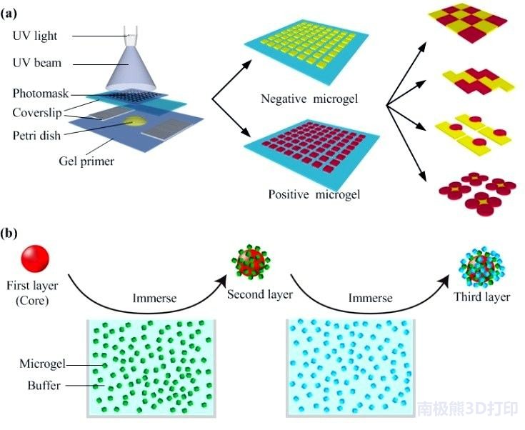 水凝胶是一种具有高水含量的亲水性或双亲性聚合物三维网络 .由于水凝胶具有良好的 生物相容性, 以及与人体软组织相似的力学性质,因此被广泛应用于组织工程支架材料与药物的可控释放中.目前, 传统的水凝胶制备方法主要是通过高分子链间的化学反应或物理相互作用,难以实现对水凝胶外部和内部结构的精确调控.而3D打印技术则能实现对材料外部形态和内部微结构的精确调控, 有利于调控细胞的分布,以及材料与生物体的匹配,因此具有独特的优势.适用于立体印刷技术制备水凝胶的常用原料包括(甲基)丙烯酸酯封端的PEG,并可通过引入细胞黏附肽RGD、肝素等生物分子,实现在微观结构上调控细胞的黏附或生长因子的释放,当然南极熊在相关方面也有过报道: