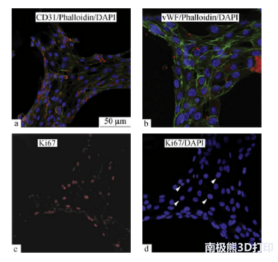 天然高分子也可作为立体印刷技术的原料制备水凝胶.例如,以甲基丙烯酸酯修饰的明胶为原料,制备了微结构可控的水凝胶 .水凝胶的力 学性质可以通过改变原料结构和高分子浓度来调节.材料孔结构的贯通性能促进人脐静脉内皮细胞(HUVEC)的均一分布和分化, 并能维持细胞的表型和生物功能(图4).另外,以苄酯修饰的透明质酸衍生物或甲基丙烯酸羟乙基酯(HEMA)修饰的葡聚糖/透明质酸(Dex-HEMA/HAc)为原料制备的3D水凝胶,具有良好的细胞相容性 .通 过以苄酯修饰的透明质酸衍生物为原料,成功制 备了耳廓支架