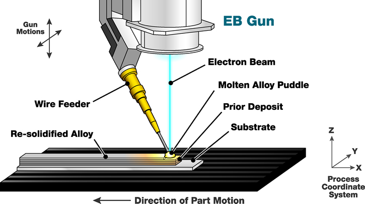 电子束熔丝沉积技术又称为电子束自由成形制造技术(Electron Beam Freeform Fabrication,EBF3)。在真空环境中,高能量密度的电子束轰击金属表面形成熔池,金属丝材通过送丝装置送入熔池并熔化,同时熔池按照预先规划的路径运动,金属材料逐层凝固堆积,形成致密的冶金结合,直至制造出金属零件或毛坯。