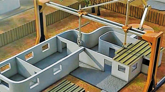 随着技术不断发展,未来甚至将出现巨型3D打印机,在现场打印出整栋建筑,类似双龙门吊样式的3D打印机主体结构,打印机可像塔吊一样升降,在最上面布置若干可变位置的桁条,每根桁条上设置一只打印头,根据面积大小布置十数只到数十只打印头。建筑竖向结构可直接一层层往上打印,模块化的结构钢筋在现场用吊车吊到上面进行焊接组装,打印头可采用类似古代夯土墙的工具一样夹着钢筋网一层一层往上堆叠混凝土。一旦这种巨型打印机出现,将会为整个商品混凝土行业带来巨大的改变,同时对于中小型的商品混凝土企业来说,也是一个巨大的挑战,这种用于3D打印的混凝土技术更加复杂、质量要求更高。