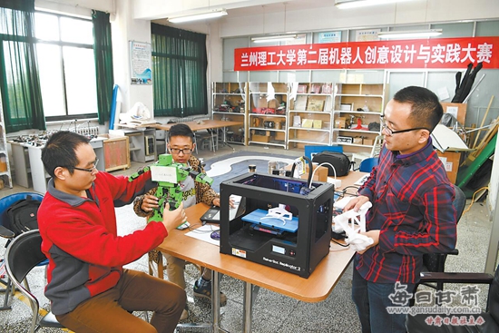 西北师范大学3D实验室的老师和同学们一起研究改造3D打印机。