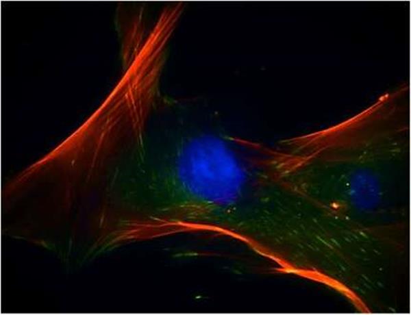 用针对感兴趣区域的抗体标记物进行人间充质干细胞表征。使用DAPI(蓝色,细胞核)FITC-鬼笔环肽(红色,F-肌动蛋白或细胞骨架)和纽蛋白(绿色,膜 - 细胞骨架蛋白)。图片来源:欧洲干细胞