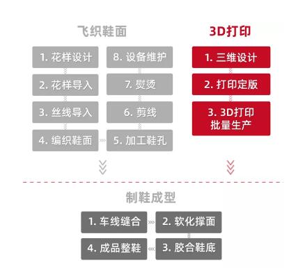 以匹克的3D打印实践为例,3D打印技术的价值从两个层面上得以释放,分别体现出该技术的生产效益与运动鞋履产品生命周期中的效益。对生产而言,3D打印无需模具,可制造功能集成的组件,显著减少了生产工序。
