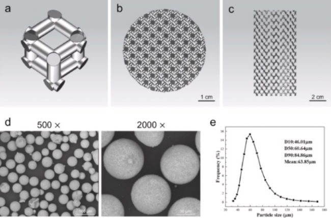 图1. 3D 打印JDBM植入物的设计和 Mg-Nd-Zn-Zr 粉末的表征。a) 钻石型晶胞。b) 计算机辅助设计模型的俯视图。c) 计算机辅助设计模型的侧视图。d) Mg-Nd-Zn-Zr 粉末的 SEM 图像。e) Mg-Nd-Zn-Zr 粉末的粒度分布。