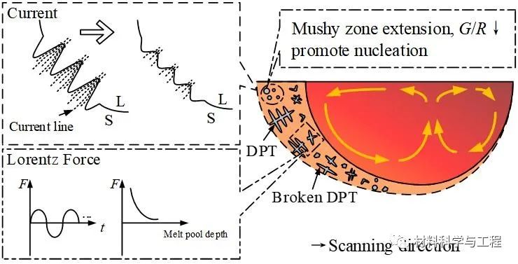FEMI-DED过程中,感应电流使凝固区域的冷却速率变小,这有利于溶质的扩散和残余应力的释放。熔池后部的温度梯度G减小,生长速率R增加,使得成核倾向增大。另一方面,由于熔池中不均匀的交变电磁力产生的压拉力和剪切力,以及溶质驱动的重熔作用使得TiC发生破碎,从而对复材组织形态实现了有效的调控。
