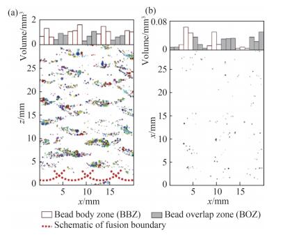 Fig.8 All detected pores of two Ti alloy parts projected onto a single plane(a)Low-density part;(b)High-density part
