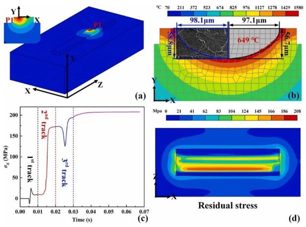 图9 在P=200 W和v=100 mm/s时,LPBF中温度场和应力场的模拟结果:(a)温度场;(b)实验验证;(c)计算P1处的X分量热应力;(d)X分量残余应力分布