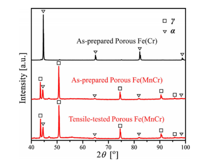图6 拉伸试验后制备的多孔Fe(Cr)和Fe(MnCr)以及多孔Fe(MnCr)的XRD图谱。