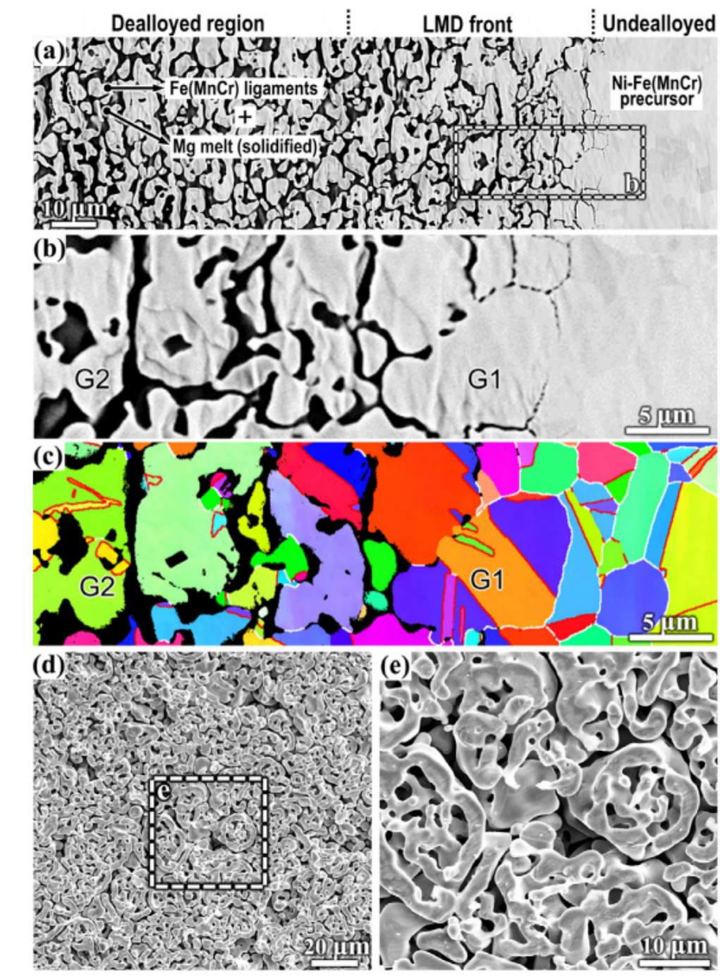 图2 (a-b)()40的LMD去合金化前沿的SEM和(c) EBSD图像(d-e)