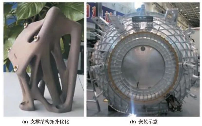 在支架等承载结构方面,欧洲宇航局(ESA)联合瑞士RUAG公司和美国Altair公司开发了一套新的支架系统,用于“哨兵-1c”和“哨兵-1d”卫星结构中。开发者使用拓扑优化技术对支架结构进行概念设计,然后通过增材制造技术进行生产。与传统设计相比,新型支架结构质量减少了40%,通过了航空领域的综合性能测试。空客公司联合西班牙先进航空航天技术中心(CATEC)对“织女星”火箭连接支架进行了拓扑优化设计及增材制造,在保证刚度不变的情况下,其质量减小了约50%。Hayduke等将拓扑优化、增材制造与铸造技术相结合,实现了对某导弹结构部件的优化设计及制造。ESA联合弗劳恩霍夫材料与光束技术研究所(IWS)和空中客车公司(Airbus)开发了一种混合增材制造技术,将激光金属沉积(laser metal deposition,LMD)的高灵活性与低温加工的精确性相结合,用于制造大型钛合金部件,其直径为1.5 m的反射镜支架结构如图13所示。空客公司研发人员基于生物启迪实现了跨尺度仿生点阵结构设计:在宏观尺度上,基于“黏菌自适应网络”算法实现了主体结构设计;在微观尺度上,该构件借鉴了骨骼生长的生物灵感,完成了超过66 000个网格的排布,实现了微观网格稠密度与应力分布相匹配。最终,使该跨尺度仿生点阵构件较原蜂窝复合材料隔板结构在相同冲力下(9 g的重力加速度)的位移减少了8%(9 mm)。在成形工艺上,该构件采用112个部件组装而成,相较于原蜂窝复合材料隔板构件减重45%(30 kg),可使空客公司每年节省465 000 t二氧化碳排放量,并有望将此设计批量化应用于A320客机上,设计结果如图14所示。我国2019年发射的嫦娥四号中继卫星“鹊桥”上的动量轮支架,采用增材制造技术加工完成,减重50%。Jiang等基于拓扑优化方法对导弹发动机支架结构进行设计,并进行了3D打印及试验验证,如图15所示。结果表明,在保证性能的前提下,结构质量减小了11.06%,同时3D打印技术大大缩短了开发周期。Li等提出一种基于弹体结构的布置方案和参数模型,实现弹体结构快速设计、建模和自动调整的方法,开发了弹体结构快速设计模块,实现了弹体结构的快速设计、自动调整,以及质量、重心等数据的自动计算和更新。倪维宇等提出阻尼复合结构拓扑优化设计方法,对某航天器安装板阻尼材料分布进行了拓扑优化设计,优化后复合结构的动力学性能显著提高。许焕宾等基于“功能优先”原则,借助solid Thinking Inspire软件,对支架的传力路径进行优化分析,再结合3D打印技术,采用高刚、高强的轻质栅格夹层壳结构,通过径向、轴向、周向的变厚度设计,实现结构承载比为4%的轻质高强结构。Shi等基于热弹性拓扑优化,对某航空支架进行优化设计并增材制造,在满足设计约束条件下,质量减小18%。张啸雨等发展了基于蒙皮点(moving morphable component,MMC)的拓扑优化方法,完成了面向增材制造的中国空间站某相机支撑结构的优化设计,该结构采用激光选区熔化成形(selective laser melting,SLM)工艺制造,通过了力学试验考核,实现结构减重50%,其基频相较原结构提高35%,完成了基于MMC方法的蒙皮点阵一体化结构在我国载人航天领域的首次型号应用与在轨验证,如图16所示。该团队进一步将拓扑优化方法与细观点阵填充相结合,完成了中巴地球资源04A卫星、资源03卫星等航天器关键设备支撑结构的优化设计与研制,实现了在多个型号航天器中的在轨应用。
