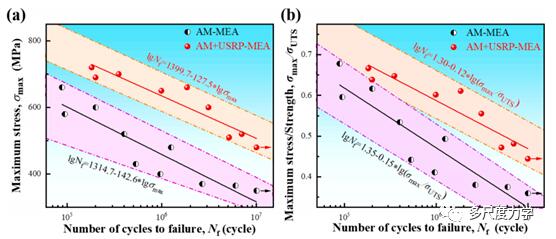 (a)AM-MEA和AM+USRP-MEA试样的最大应力-失效循环数(S-N)曲线;(b)(a)中各试样经各自UTS归一化后的最大应力,其中虚线表示实验数据的边界。