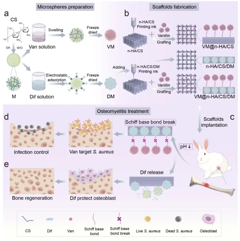 当前骨髓炎治疗中,实现感染控制与骨再生的时空协调颇具挑战,细菌诱导的酸性微环境及毒素介导的成骨细胞功能障碍是关键难题。传统策略如抗生素与支架结合,存在局部浓度不足、材料不可降解或药物突释致细胞毒性等问题。来自四川大学的李玉宝教授、邹琴副研究员团队合作,开发出3D打印壳聚糖基pH响应双功能支架VM@n-HA/CS/DM。该支架通过希夫碱键将载万古霉素壳聚糖微球(VM)结合于支架表面,酸性环境下选择性释放药物靶向杀灭金黄色葡萄球菌,同时支架基质中分散的载双氯芬酸壳聚糖微球(DM)持续释放抑制毒素表达、保护成骨细胞,其分层多孔结构兼顾营养运输与机械强度。相关工作以《A 3D-printed chitosan-based pH-responsive dual functional scaffold for osteomyelitis: synergistic antibacterial and osteogenic treatment》为题发表在《Carbohydrate Polymers》上。