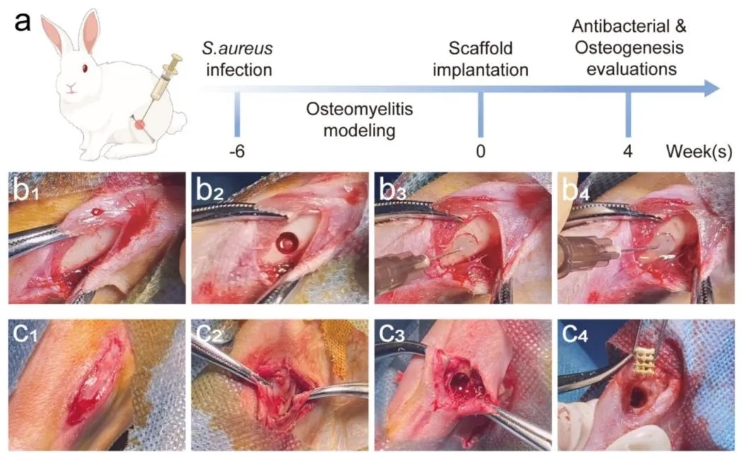 通过钻孔植入金黄色葡萄球菌与鱼肝油酸钠,构建感染模型后清创并植入不同支架,研究支架在体内的治疗效果,结果表明VM@n-HA/CS/DM组术后4周骨缺损修复最佳,皮质骨光滑且骨小梁连续。