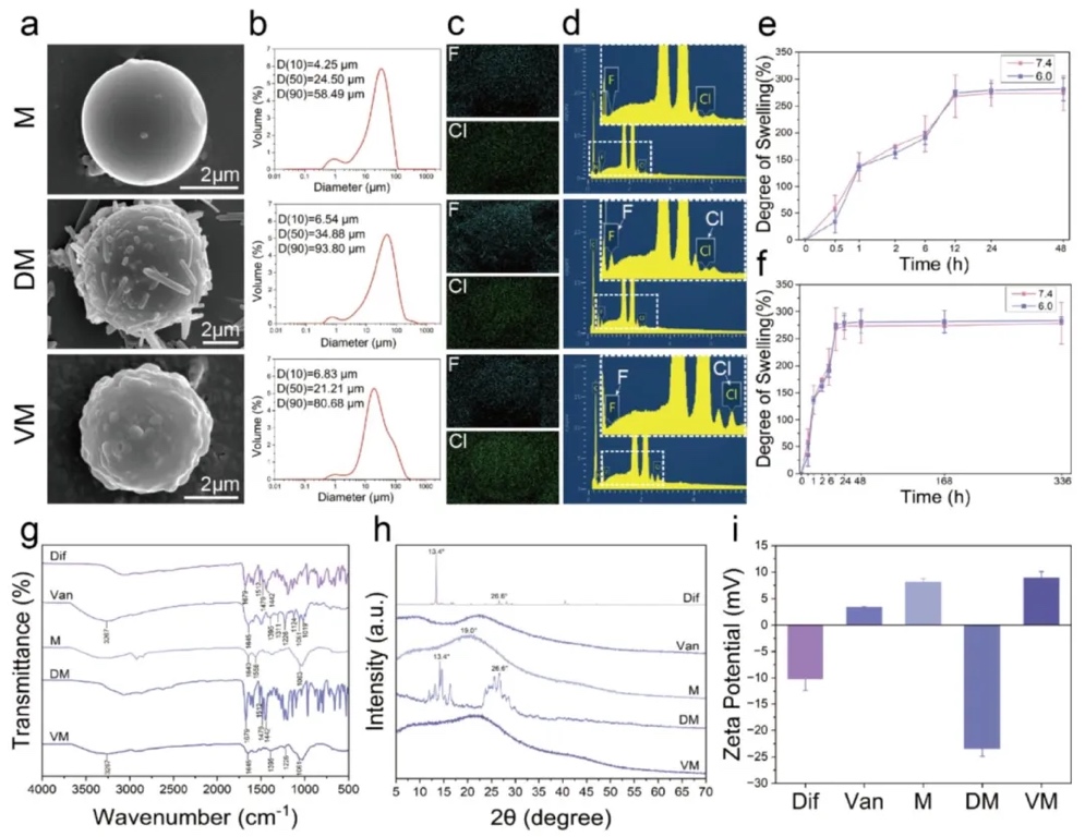 通过扫描电镜、激光粒度仪、红外光谱等手段,研究VM和DM的形貌、粒径、化学结构及 swelling 行为,结果表明VM表面光滑、DM含药物结晶,微球在pH6.0环境 swelling 率更高,成功负载药物且结构稳定。