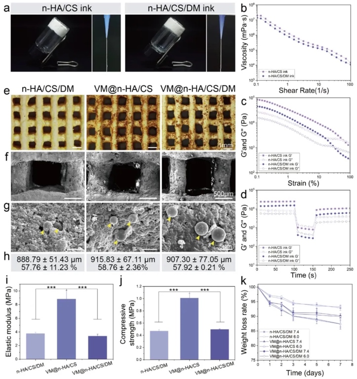 通过流变学分析、扫描电镜、压缩测试及降解实验,研究支架的打印适性、微观结构、机械强度及降解行为,结果表明支架具剪切稀化特性,孔隙率约58%,VM@n-HA/CS组弹性模量达8.82MPa,pH6.0环境降解更快。