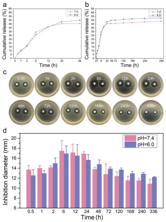 通过透析法测定万古霉素释放曲线,结合抑菌环实验,研究VM在不同pH下的释药规律及杀菌能力,结果表明pH6.0时14天累计释放52.58%,抑菌环直径达12.21mm,酸性环境释药更快且抗菌效果更强。