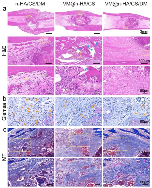 通过H&E、Giemsa和Masson染色,观察骨组织炎症细胞浸润、细菌残留及胶原沉积,研究支架的抗菌与成骨能力,结果表明VM@n-HA/CS/DM组炎症细胞少、无细菌残留,胶原纤维排列整齐,新骨生成显著。