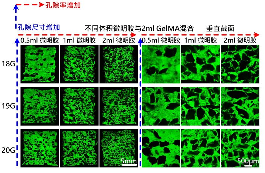通过调整不同挤出喷头制备不同尺寸的微明胶,可以实现具有不同尺寸孔隙结构的打印。此外,调整预凝胶生物墨水中的微明胶比例,可以实现不同孔隙率结构打印。(图4)