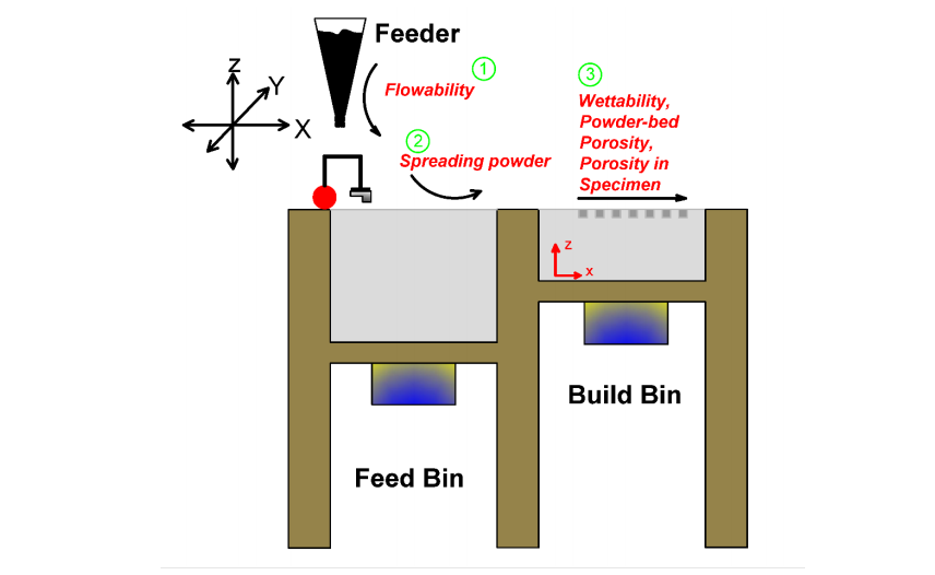 粉末型3D打印机的示意图,其中包括流动性,润湿性,粉末床孔隙率和样品中的孔隙率之间的关系。