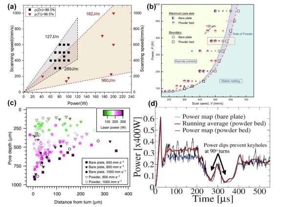 图8 激光能量对LPBF孔隙率的影响:(a)纯锌和Ti6Al4V的加工窗口,(b)Ti6Al4V的小孔孔隙率,(c)与转折点不同距离处的孔深,以及(d)抑制孔隙率的功率图
