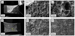 图6。冲击断口的SEM图像:热处理前试样的断口形貌(a)和选区扩大(b,c),在1200°下热处理1小时的试样的断口形态(d),以及选区扩大(e,f)。