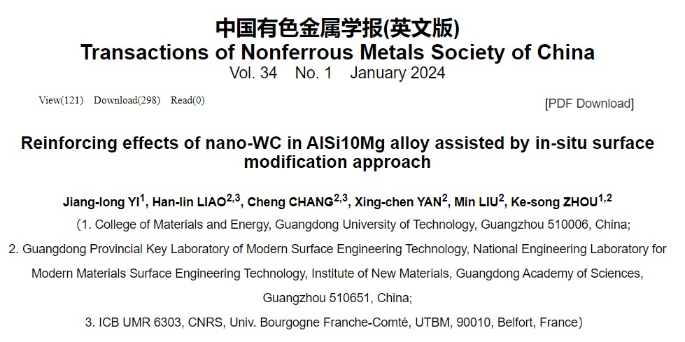 Jiang-long YI, Han-lin LIAO, Cheng CHANG, Xing-chen YAN, Min LIU, Ke-song ZHOU. Reinforcing effects of nano-WC in AlSi10Mg alloy assisted by in-situ surface modification approach [J]. Transactions of Nonferrous Metals Society of China, 2024, 34 (01): 50-64.