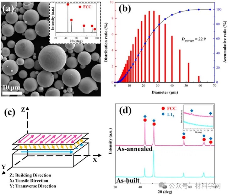图1所示。(a)预合金粉末的形貌。(b)预合金粉末粒度分布图。(c) SLM过程的示意图。(d)铸态和退火态合金的XRD图谱。