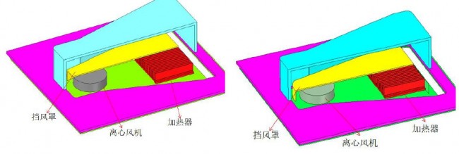 本报告中给出两种挡风罩形式,添加挡风罩的目的之一为在竖直方向上,限制气流的扩展;其二为在左右方向上限制气流的流动。两种挡风罩形式如下,区别在于是否将风机上边的位置封口。